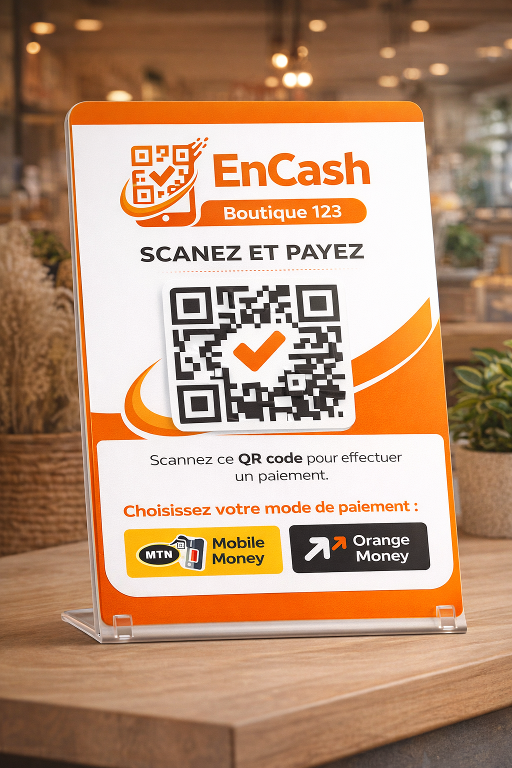 EnCash vous fournit une plaque physique ou numérique avec votre QR Code unique. Collez-la ou affichez-la à votre caisse, sur votre table ou sur votre vitrine.